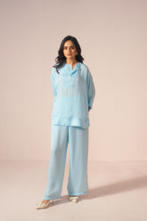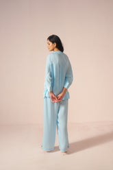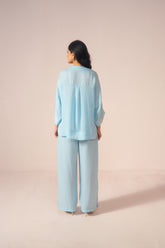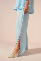 Sky Drift captures the calm of clear skies in a wearable, everyday statement. Its soft blue tone is paired with a fluid, breathable fabric that feels easy all day long. The sleek slit pants add a hint of modern playfulness, making it a piece you can wear from daytime meetings to evening outings.